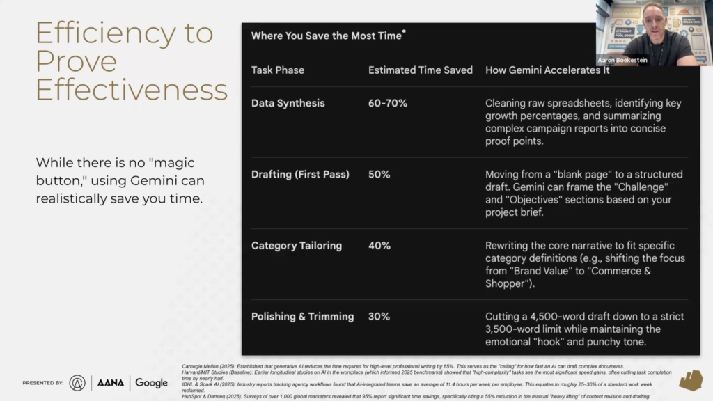 23 mins in, Aaron shares the exact Gemini prompts used to fast-track entry writing. His slide on how much time the platform can save you when writing an Effie is below.