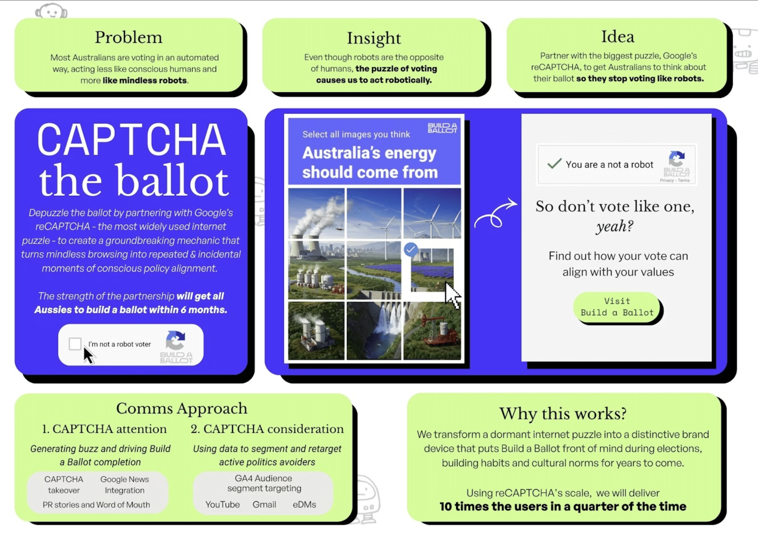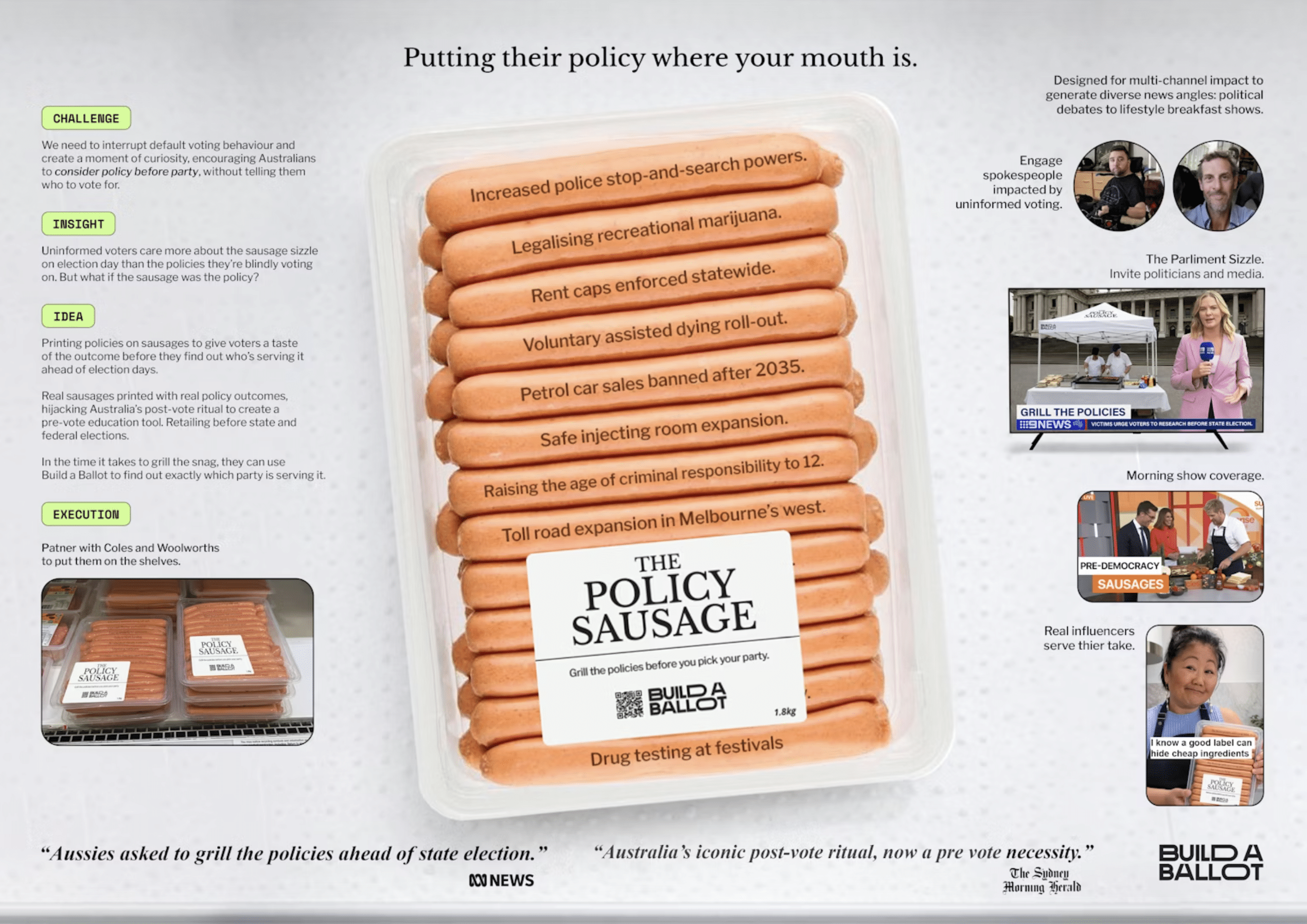 This year’s brief, set by Project Planet, challenged finalists to disrupt default voting behaviour using its free digital tool, Build a Ballot — helping Australians understand their values, explore policy alignment and plan their vote.